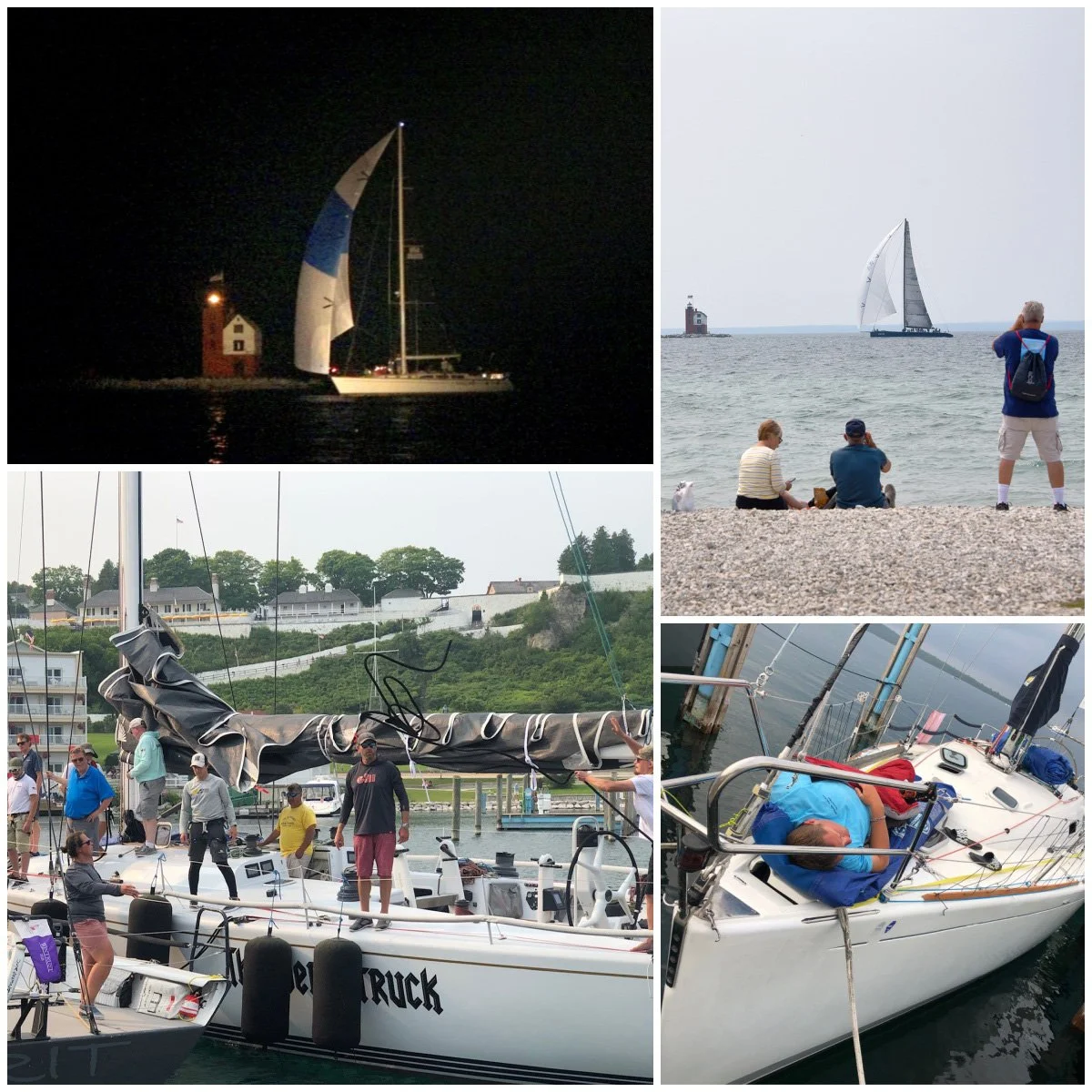 On Mackinac Island (from left top) Eagle One, overall Cruising Division winner, was first to finish; OC86 was the first racing monohull to finish; sneaking a nap after racing; docking at Mackinac Island. (photos supplied by Chicago Yacht Club)