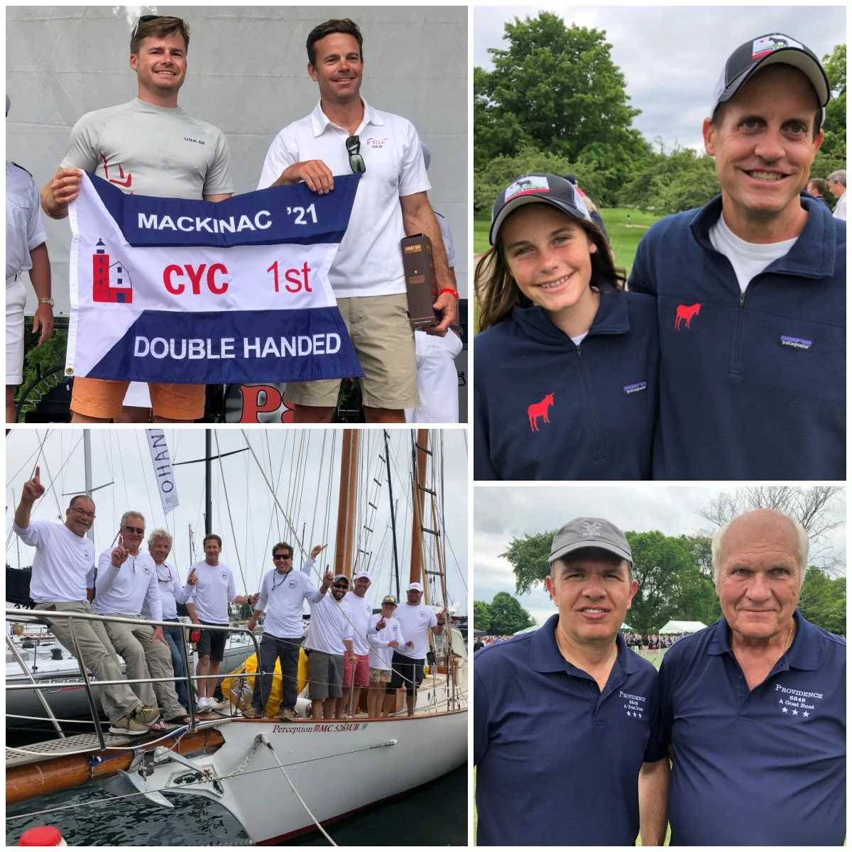 Clockwise from upper left, Doubehanded winners Andy Graff (right) and Scott Eisenhardt; Merritt and Scott Sellers ( Mackinac Cup winners); Greg (left) and Jerry Miarecki (Chicago-Mackinac Trophy winners); Perception, Cruising 3 winners. (photo supplied by Chicago Yacht Club)